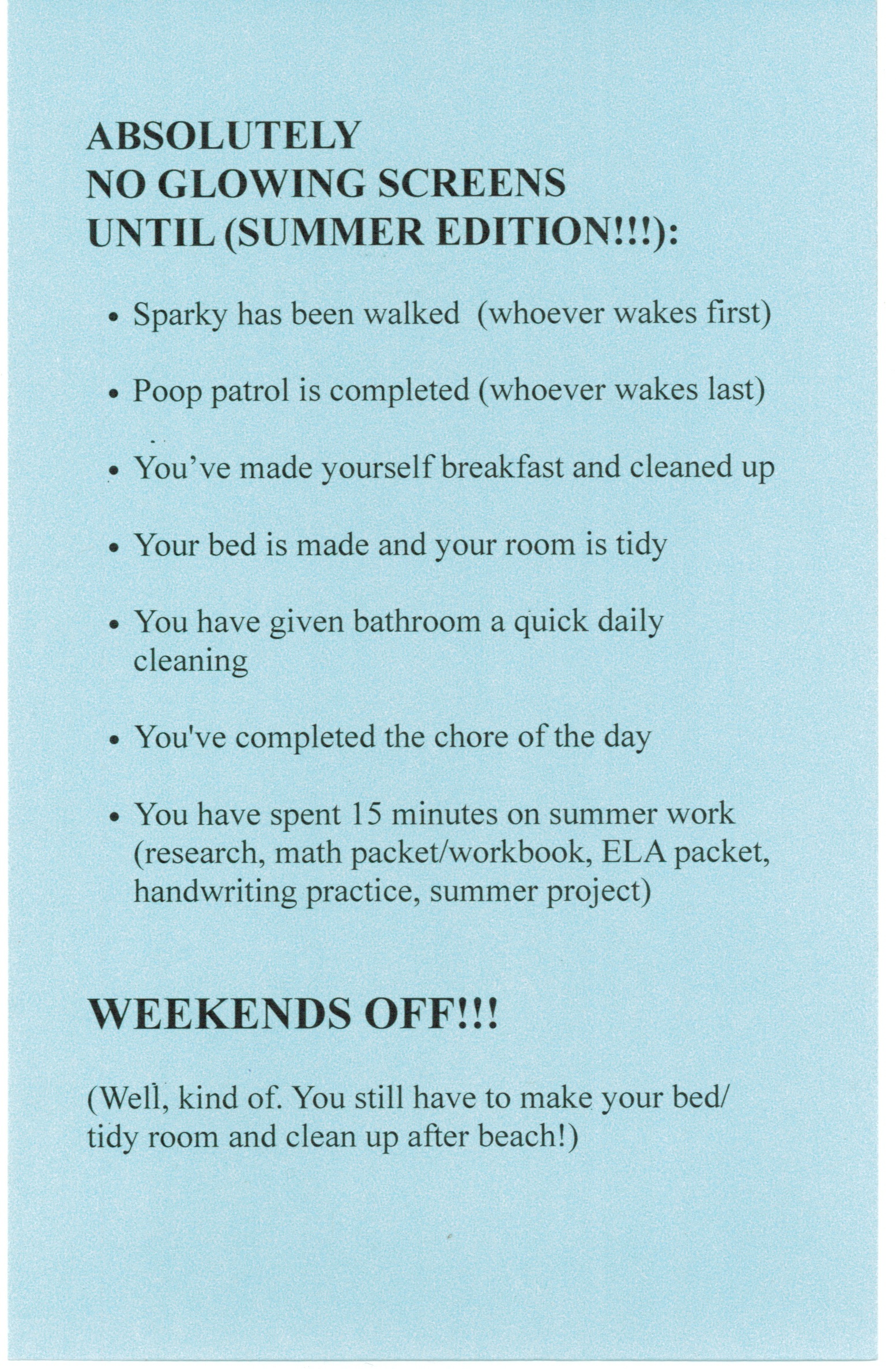 That’s certainly been the case for my son. He’s 14 now, about to enter high school, (although his school goes from grade 6 through 12, so it won’t be the same kind of transition it is for many kids). He is an early riser like me, so when he wandered into our Room of Requirement (the basement is an open space that hosts both my home office and the family rec/computer area) each morning, I’d just remind him to do the list before he got started on the machines. He was pretty good about it, too. He’d do his chores, then read.
