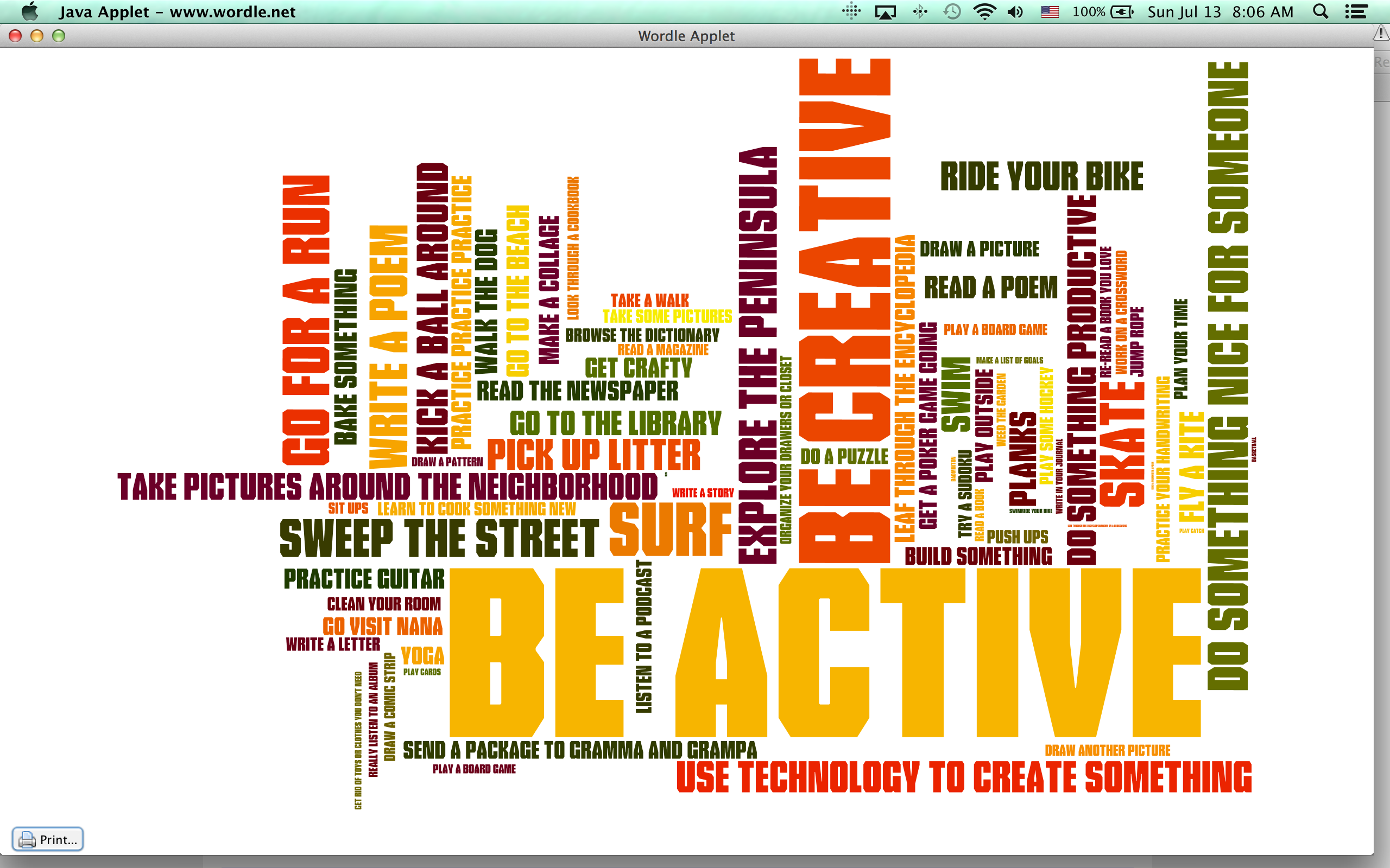 Anyway, when I started instituting “creative time” last winter, I generated this little Wordle and hung it in the kitchen. It’s just a hodgepodge of ideas so I always have an answer to “I can’t think of anything to do.”