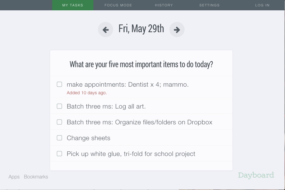 ETA: I neglected to mention in my initial post one app that has become such a part of my routine that I don’t even notice how much I rely on it anymore. The Dayboard Chrome extension is a simple add on that allows you to put your five most pressing tasks into a to-to list. The key is that every time you open a window on Chrome, you’ll see your list first. It’s designed for teams, but I find that it’s great for helping a lone gun like myself to task. I try to keep my list limited to things I can actually accomplish in a single day; what I don’t do get’s bumped to the top of the list tomorrow.  So, if I’m in the midst of a big edit, the only thing on my list might be “Five hours on chapter 12.” I don’t limit it to work stuff, though. It’s great for reminding myself to do little things like make dentist appointments. Today’s list, as you see, is not all that daunting: